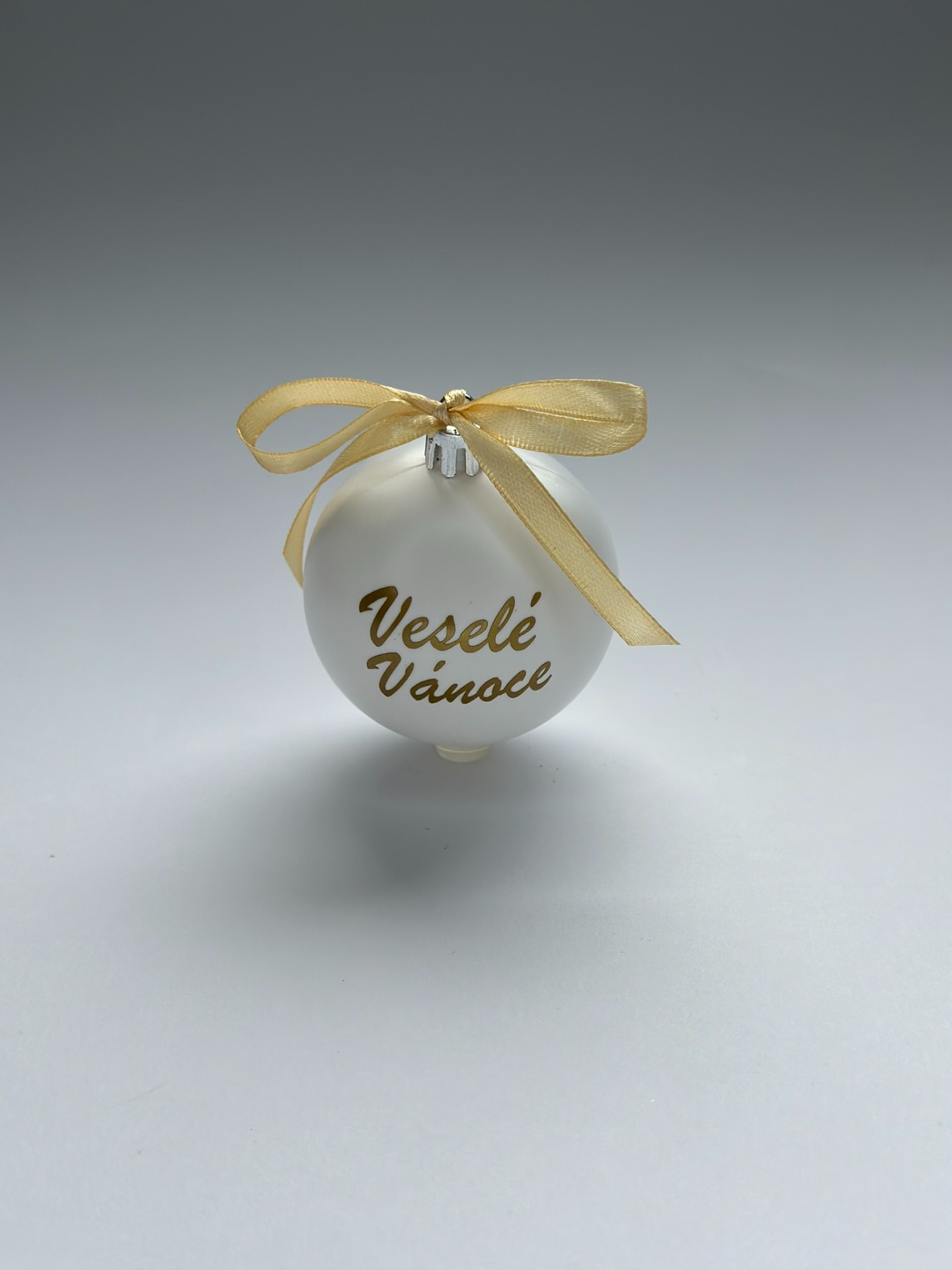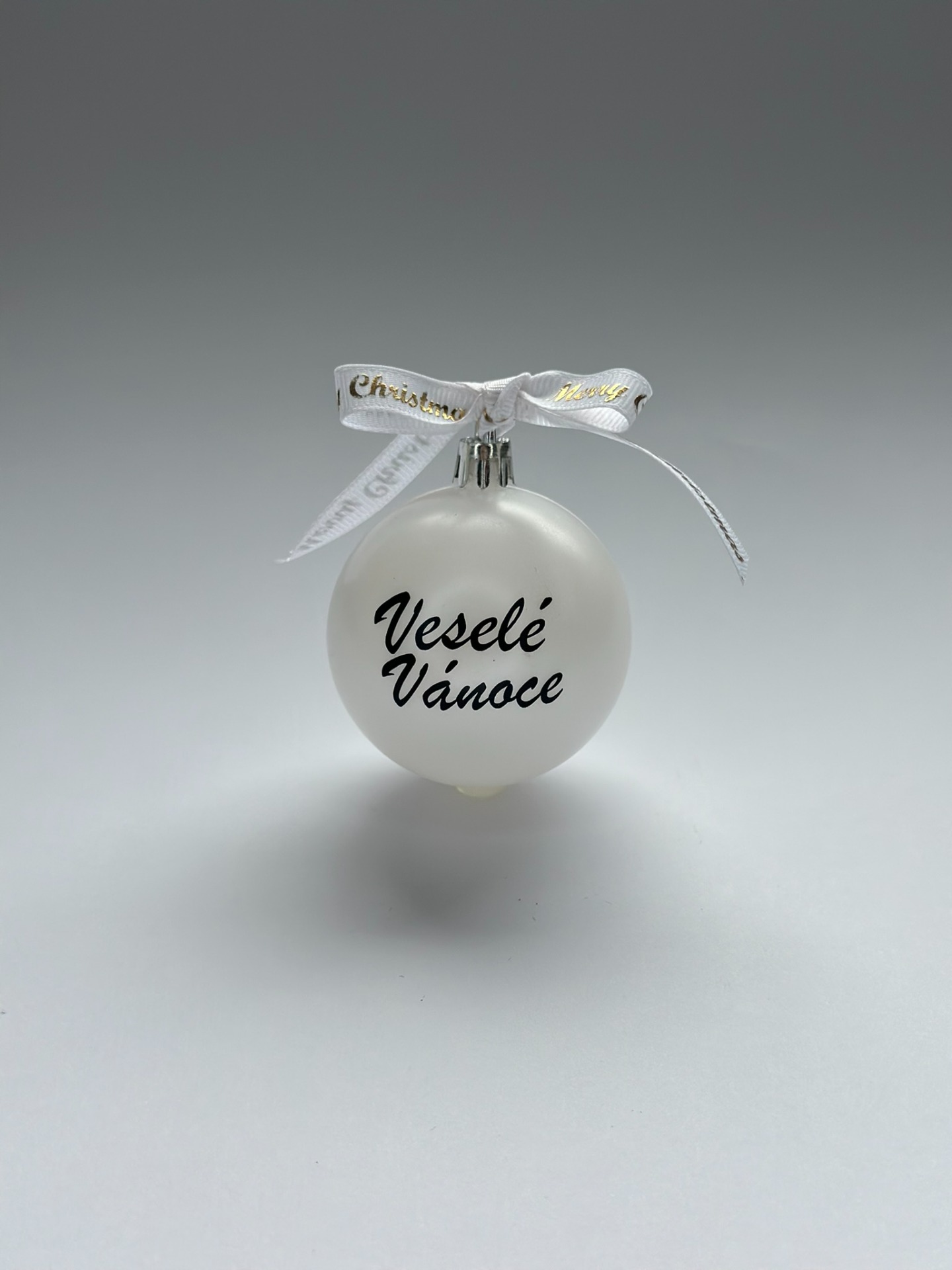 Elegantní vánoční koule v bílé barvě s nápisem "Veselé Vánoce" je dokonalým doplňkem pro váš sváteční stromeček.